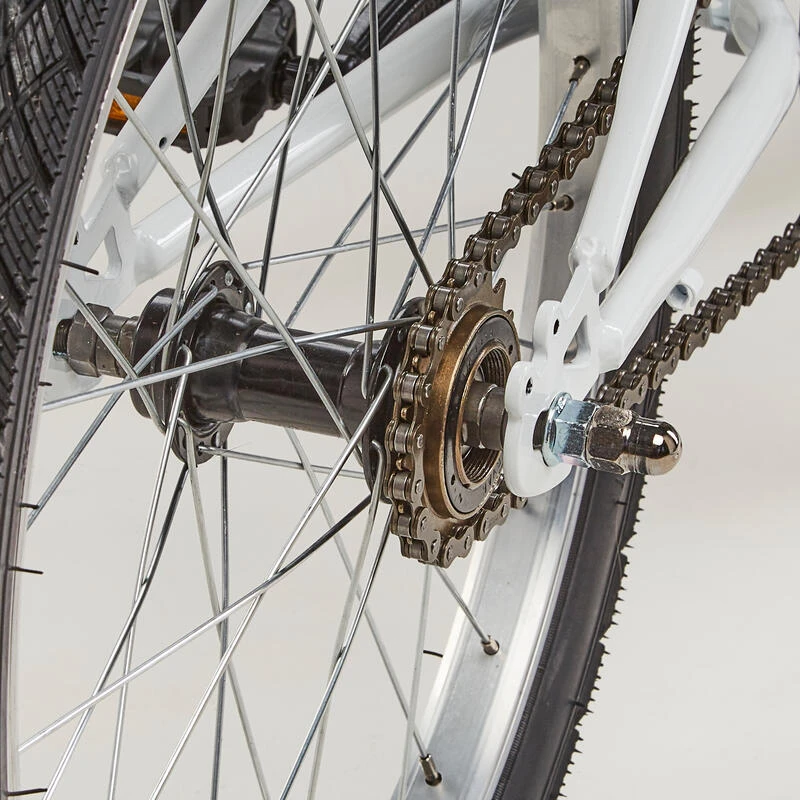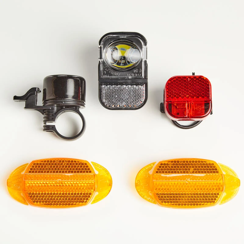 Le vélo est entièrement équipé pour rouler sur la voie publique : éclairage à piles, avertisseur sonore, réflecteurs de lumière sur les roues (catadioptres).